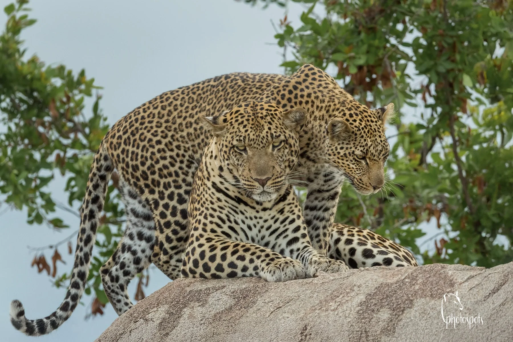 Überglücklich fuhren wir nach diesem unvergesslichen Erlebnis weiter und entdeckten die beiden Leoparden an leicht anderer Stelle wieder. Der kleine Regenschauer, der soeben vom Himmel kam, konnte uns die Stimmung nicht vermiesen. Masha legte die Plastikbahnen über das Auto und für die Kameras hatten wir wasserdichte Beutel bzw. einen Regenschutz dabei. So konnten wir trotz Wolkenbruch die beiden Leoparden ablichten, die sich noch immer der Fortpflanzung widmeten. Von Dauer war das nasse Wetter aber nicht, so dass wir schon bald wieder „oben ohne“ fahren konnten. Die beiden Katzen wanderten im Laufe des Nachmittags etwas umher, wir waren ihnen dicht auf den Fersen. Masha war jedoch unruhig. Es stellte sich heraus, dass Ranger in der Nähe waren. Masha war besorgt, dass er eine Busse für Offroad-Fahren kassieren könnte. Doch als er sah, dass auch die Wildhüter um die Steine manövrierten und sich über die Anwesenheit der Leoparden erfreuten, entspannte er sich wieder. Noch immer verführte die Leopardin das Männchen vor unseren Augen und liess uns zig 30-Sekunden-Liebesakte erleben, die mit einem zärtlichen Nackenbiss endeten.